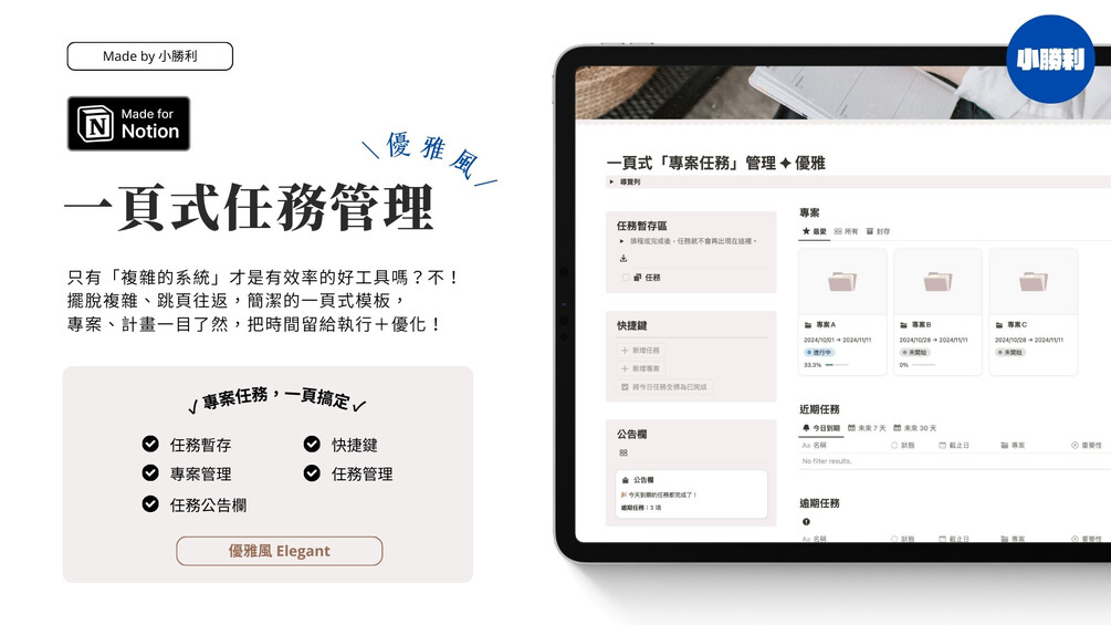 Notion 一頁式專案任務管理模板 ✦ 優雅