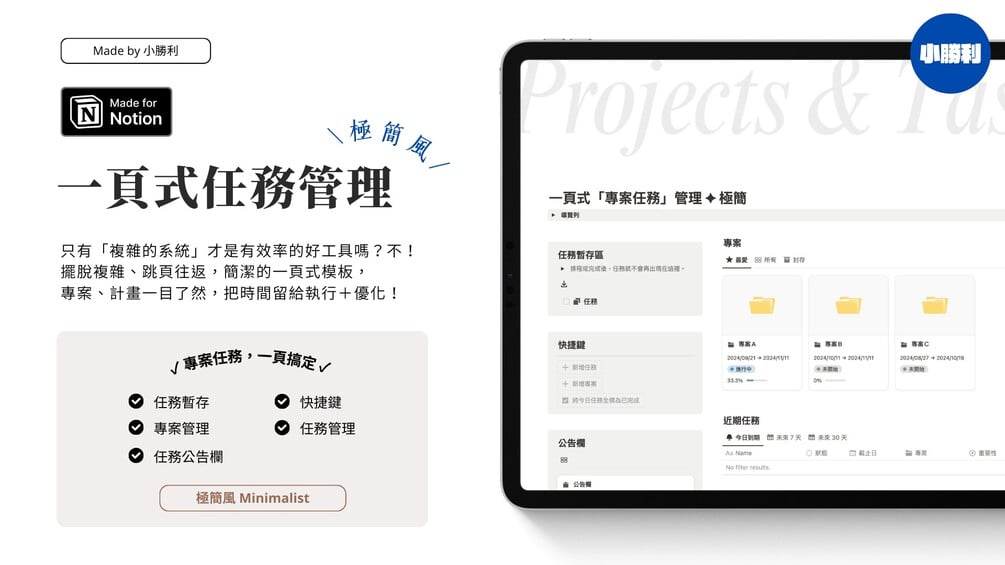 Notion 一頁式專案任務管理模板 ✦ 極簡