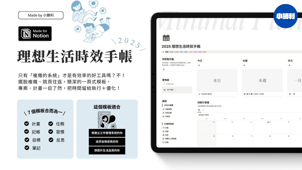 「2025 理想生活時效手帳」是你實現理想生活的最佳夥伴。這個 Notion 計畫模板,是以 Notion 為系統所打造的數位手帳,透過系統化的規劃與追蹤,一天天朝著目標邁進,創造屬於你的理想生活。