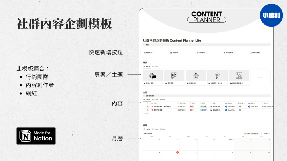 適合行銷團隊、內容創作者團隊、中小企業、網紅等需要團隊合作的內容規劃形式;