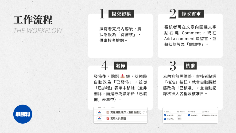 在此撰寫、審核貼文,依照進度控管。 -